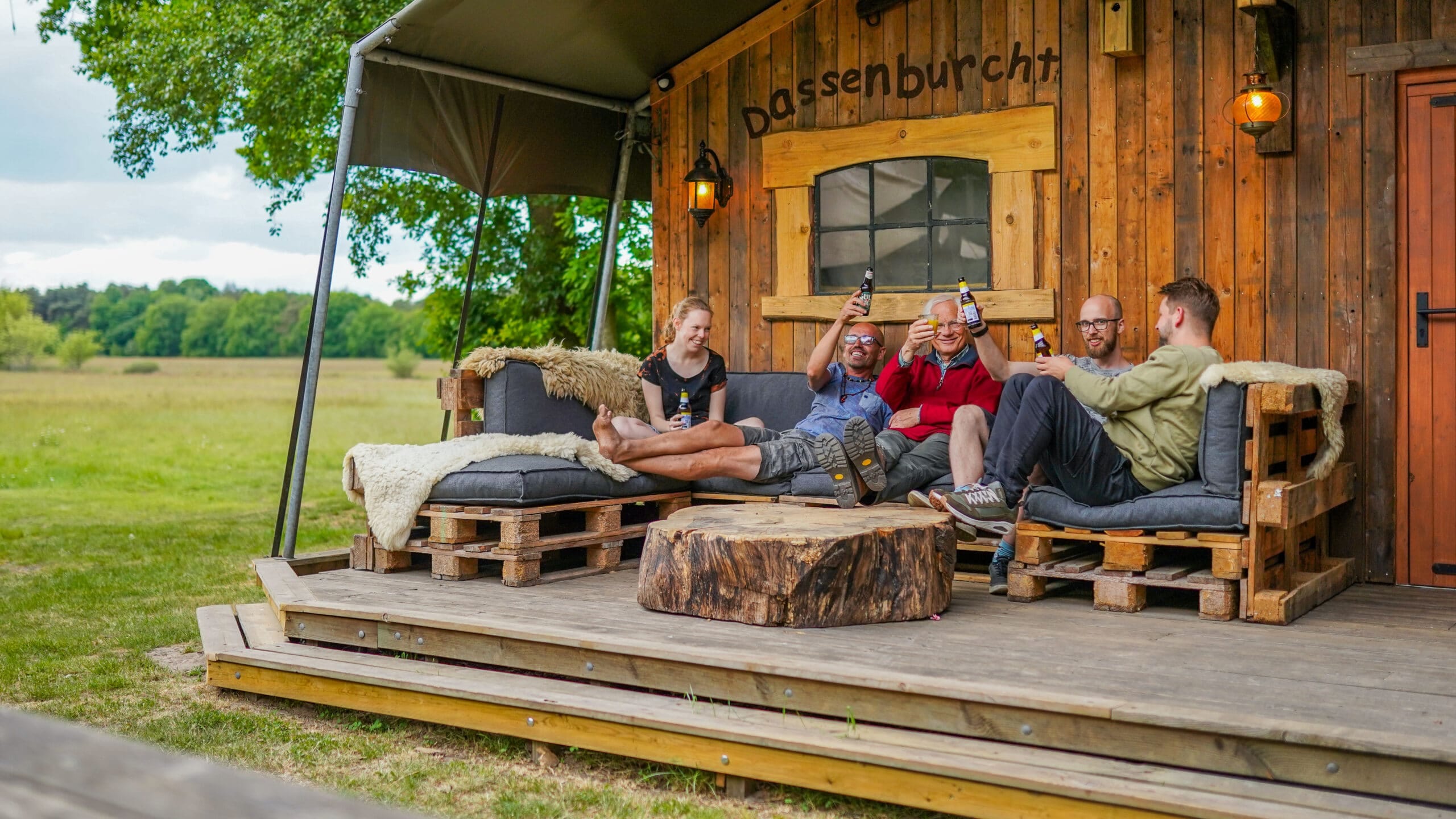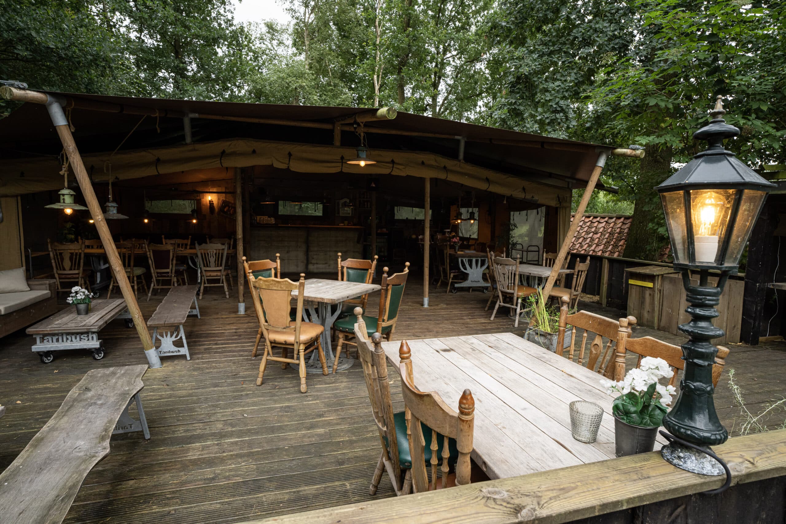 De gezelligste locatie van alle vier! De stoere safaritent Gezellig biedt ruimte aan groepen tot 35 personen. Tussen de bomen en naast z’n broertje Leuk, heb je bij de locatie je eigen terras, verwarmde tent en barretje. Kom je met een grote groep, dan voegen we Leuk & Gezellig samen, door de schuifpui te openen. In dat geval kunnen we 80 personen ontvangen.Â